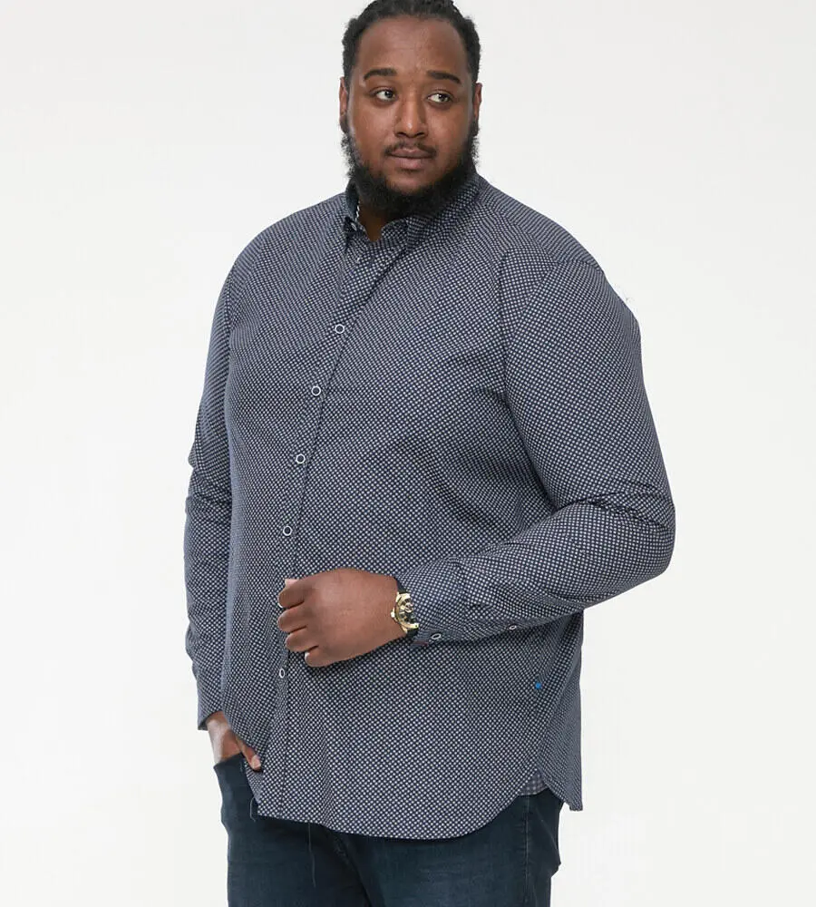 Langermet skjorte fra D555 i mørkeblå med småmønstret sandfarget print. Skjorten har klassisk krage, knappestolpe og en rett passform som gir god komfort og bevegelsesfrihet. Det lette materialet gjør den behagelig å ha på, både til hverdag og finere anledninger. Det diskrete mønsteret gir et stilrent uttrykk med litt ekstra karakter.