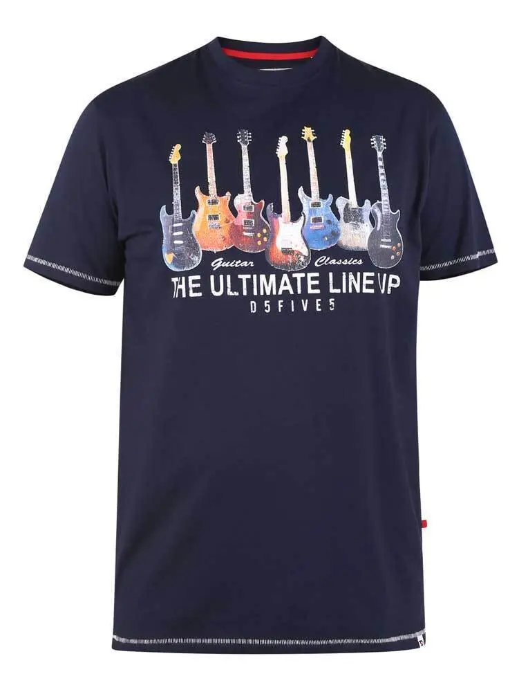 Navyblå T-skjorte med "Gitar" trykk fra D555 for den høye mannen. Den navyblå fargen er så mørk at den nesten går over i svart.