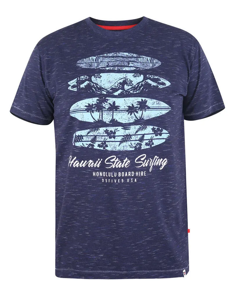 Navyblå myk T-skjorte med print fra D555 for den høye mannen. Printet viser 4 surfebrett med ulike motiver, og under står teksten "Hawaii State Surfing" trykt i hvitt.