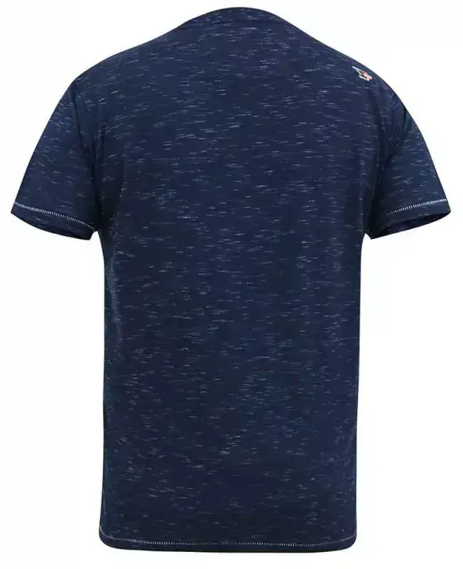 Navymelert T-skjorte med motorsykkel-trykk. Det lett krakelert trykket er i fargene lyseblå/hvit/sand og forestiller en motorsykkel foran noen fjell.