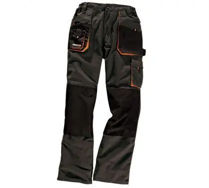 I livet er det elastikk i sidene for ekstra komfort. Arbeidsbuksene er svarte og har beltestropper, de lukkes med glidelås og knapp.
