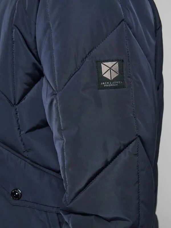 Smart marineblå overgangsjakke fra Jack & Jones. Bomberjakken/pilotjakken har en gennemgående glidelås og en klassisk høy og myk teddy-krage, som holder vinden ute.