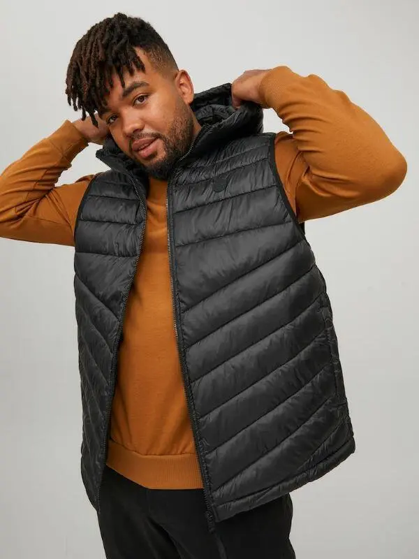 Sort vattert vest fra Jack & Jones. Vesten har hette og en gjennomgående glidelås. Det er to store utvendige lommer samt to store og dype innvendige lommer.