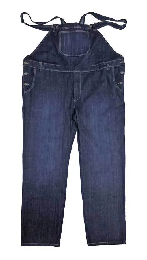 Fargen er denimblå, men disse selebuksene har mange lyse sømmer rundt lommer, stropper og kanter.