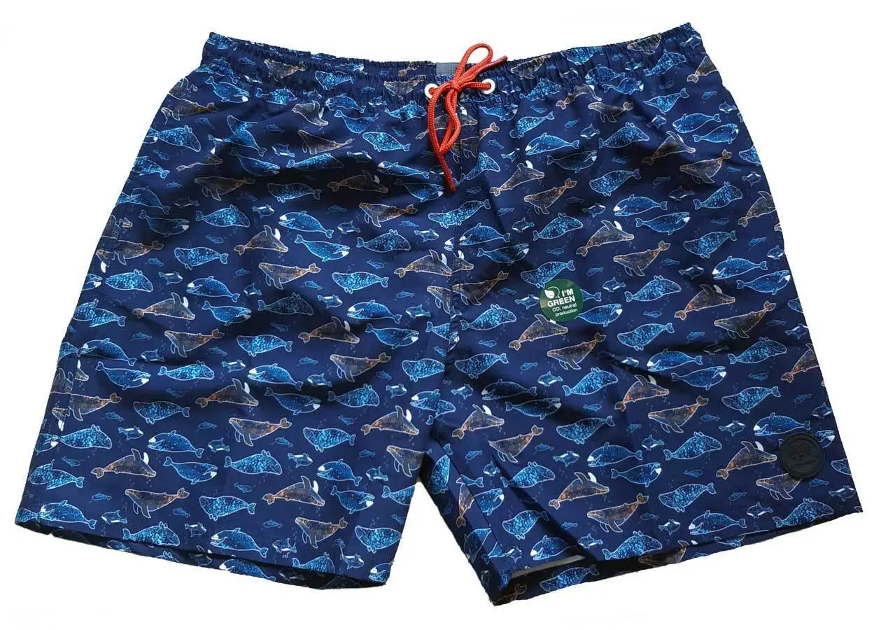 Navyblå badeshorts fra Ceceba. Badeshortsene har print av forskjellige hvaler. Det er to sidelommer foran og en baklomme med borrelåslukking.