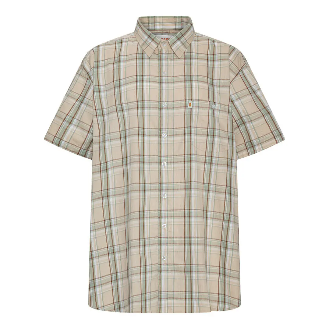 Kortermet skjorte fra KAMRO i en lett og behagelig kvalitet. Det beige rutete mønsteret kombinerer nyanser av grønt og brunt og gir skjorten et klassisk, avslappet uttrykk. Med brystlomme og vanlig krage er den perfekt til hverdagsbruk – både alene eller åpen over en T-skjorte for et mer avslappet uttrykk.