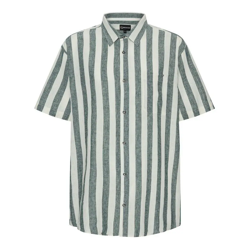 Kortermet skjorte fra Finesmekker i hvit med loddrette striper i støvet grønn, som gir et rolig og stilrent uttrykk. Skjorten har en klassisk krage og gjennomgående knappestolpe, som gjør den enkel å style både pent og avslappet.