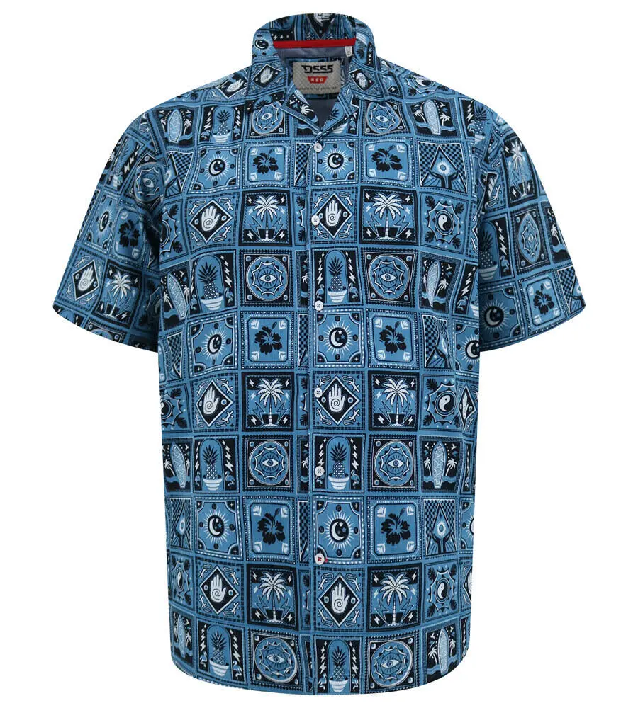 Skjorte fra D555 med et iøynefallende grafisk mønster i ulike blå nyanser. De firkantede feltene med små motiver gir skjorten et unikt og moderne uttrykk som skiller seg ut uten å bli for voldsom.