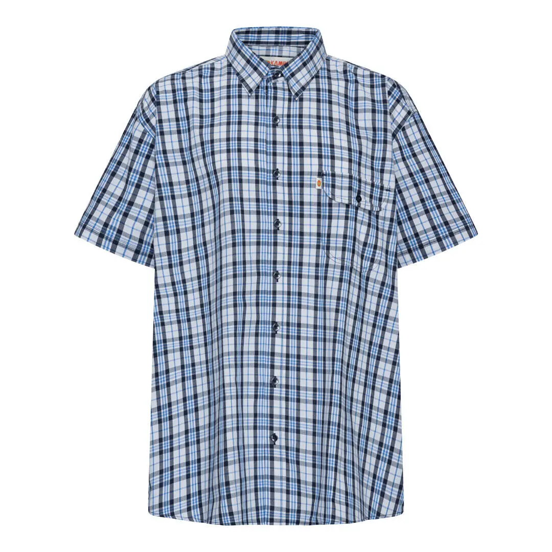 En klassisk, kortermet skjorte fra KAMRO med ruter i blå nyanser. Den har vanlig krage og knapper hele veien ned, så den er enkel å bruke både til hverdag og til finere anledninger. Rutene gir et tydelig, men likevel nøytralt uttrykk, som passer godt til jeans, chinos eller shorts. Skjorten har også en brystlomme med knapp, som er praktisk for småting.
