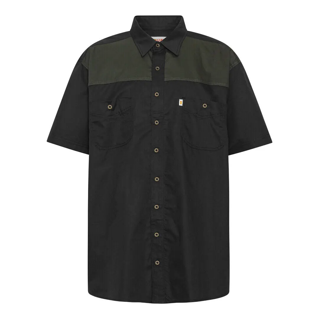 Kortermet skjorte fra KAMRO med et røft og avslappet uttrykk. Designet med to praktiske brystlommer og kontrastfarge over skuldrene, som gir skjorten karakter og kant. Den passer både til jobb og fritid og fungerer like godt lukket som åpen over en T-skjorte.
