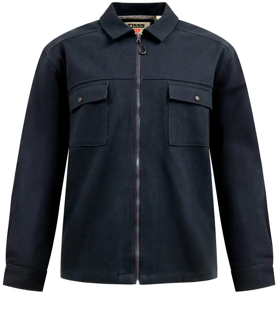 Mørk navy overskjorte fra D555 med gjennomgående glidelås og to brystlommer med klaff og knapp. Modellen har klassisk krage, lange ermer og et enkelt, stilrent uttrykk som gjør den lett å kombinere med både jeans, chinos eller joggebukser. Skjorten fungerer godt som en lett overgangsjakke eller som et ekstra lag innendørs i de kjøligere månedene. Et allsidig og praktisk valg for deg som foretrekker en avslappet og funksjonell stil.