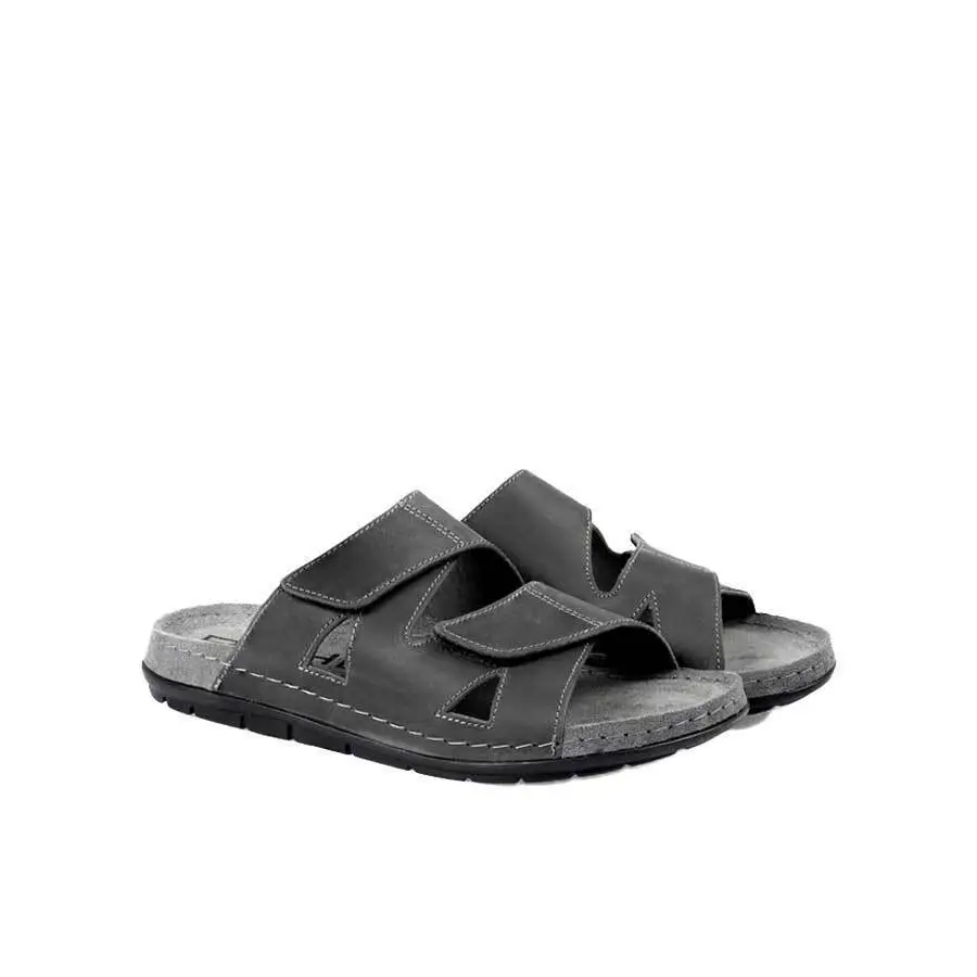 Grå herresandaler i skinn fra Rohde. Sandalene har en myk innvendig skinnsåle. Skoene lukkes enkelt med to borrelåsremmer over foten.
