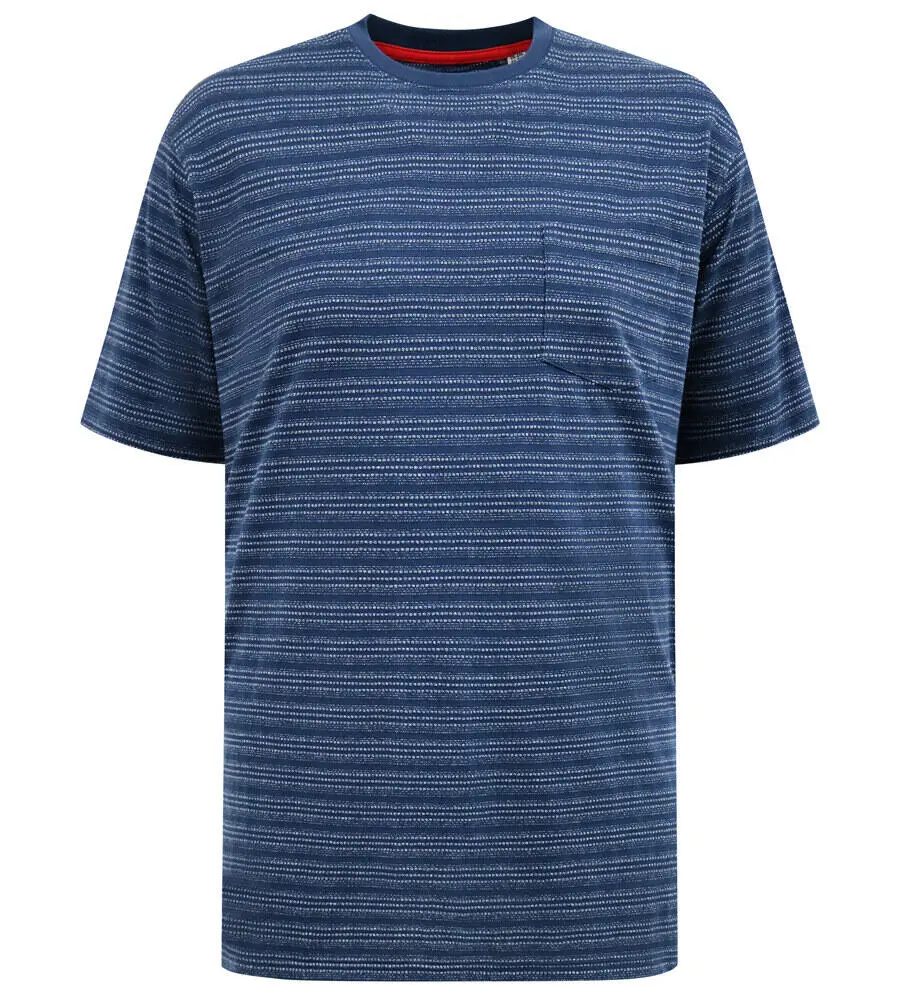 Navy blå T-skjorte fra D555 med et diskret stripete mønster, som gir et levende og stilrent uttrykk. De fine, vannrette stripene skaper spill i stoffet og gjør T-skjorten mer interessant enn en ensfarget modell.