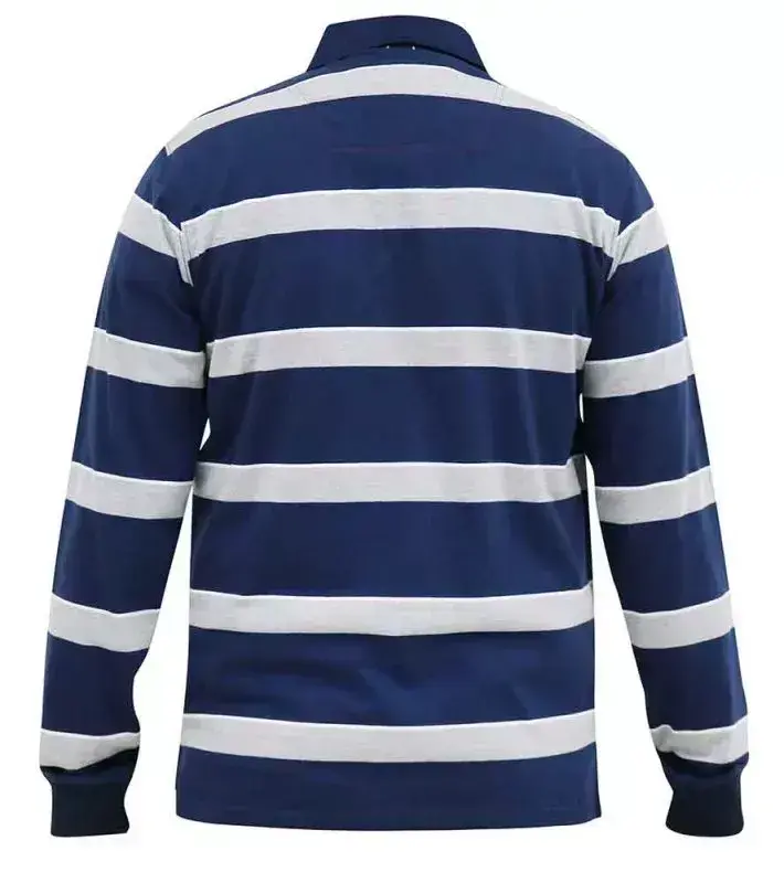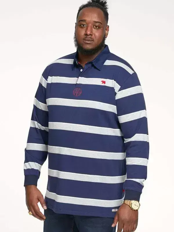 Langermet navyblå poloskjorte med brede grå striper og en tynn hvit strek øverst. Poloen er rugbyinspirert og gir et klassisk, men avslappet uttrykk.