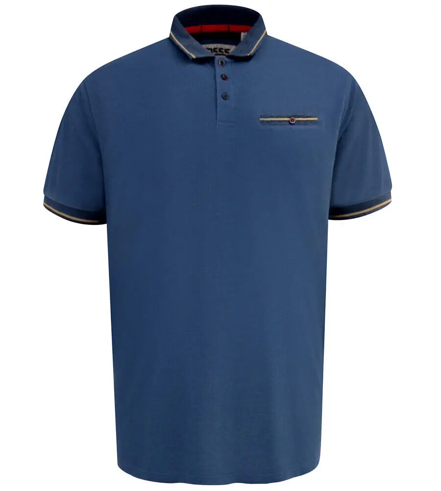 Denne blå polo T-skjorten fra D555 er en stilfull klassiker med praktiske og elegante detaljer. Den har en tidløs krage med tre knapper og en brystlomme som er markert med kontrastkant og knapp.