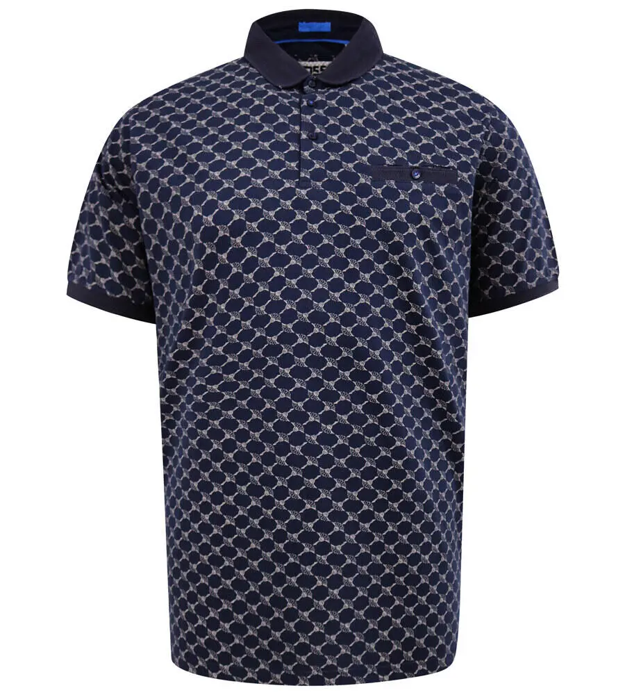 Marineblå polo fra D555 med et gjennomgående mønster som gir et stilrent og litt mer eksklusivt uttrykk. Den klassiske polokragen og knappelukking ved halsen skaper et pent uttrykk som enkelt kan brukes både til hverdag og til litt mer oppkledde anledninger.