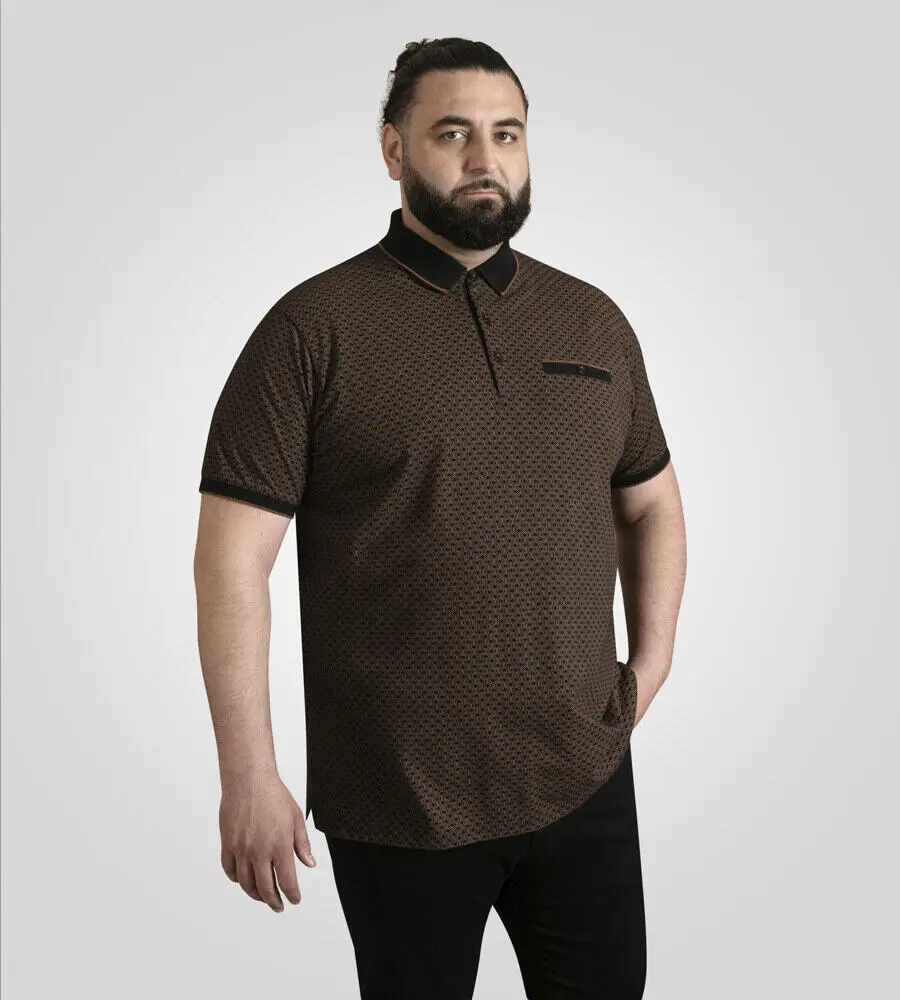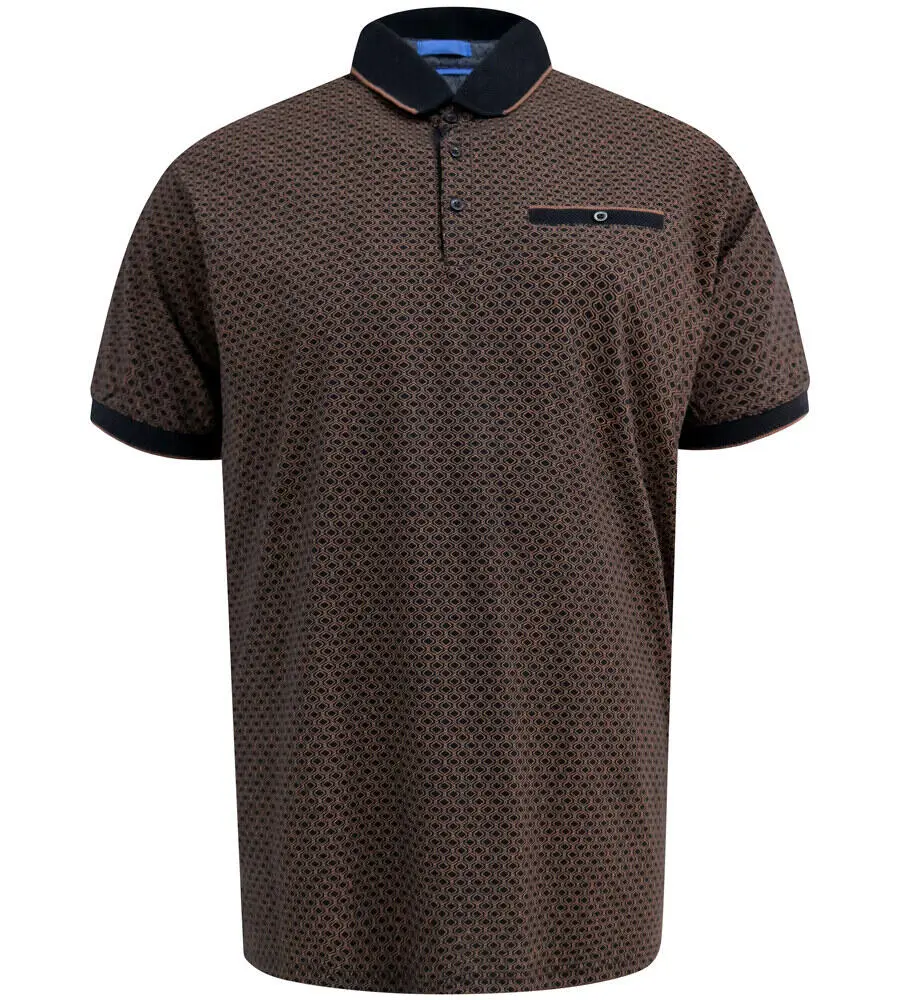 Svart polo fra D555 med diskret all-over-mønster i kontrastfarge. Modellen har svart krage og ermekanter med en tynn pyntekant som gir et skarpt og balansert uttrykk. Brystlommen har en liten knapp og matcher kragen og ermene i farge og stil. Stoffet er mykt og elastisk, noe som sikrer god komfort og en behagelig passform til hverdagsbruk.