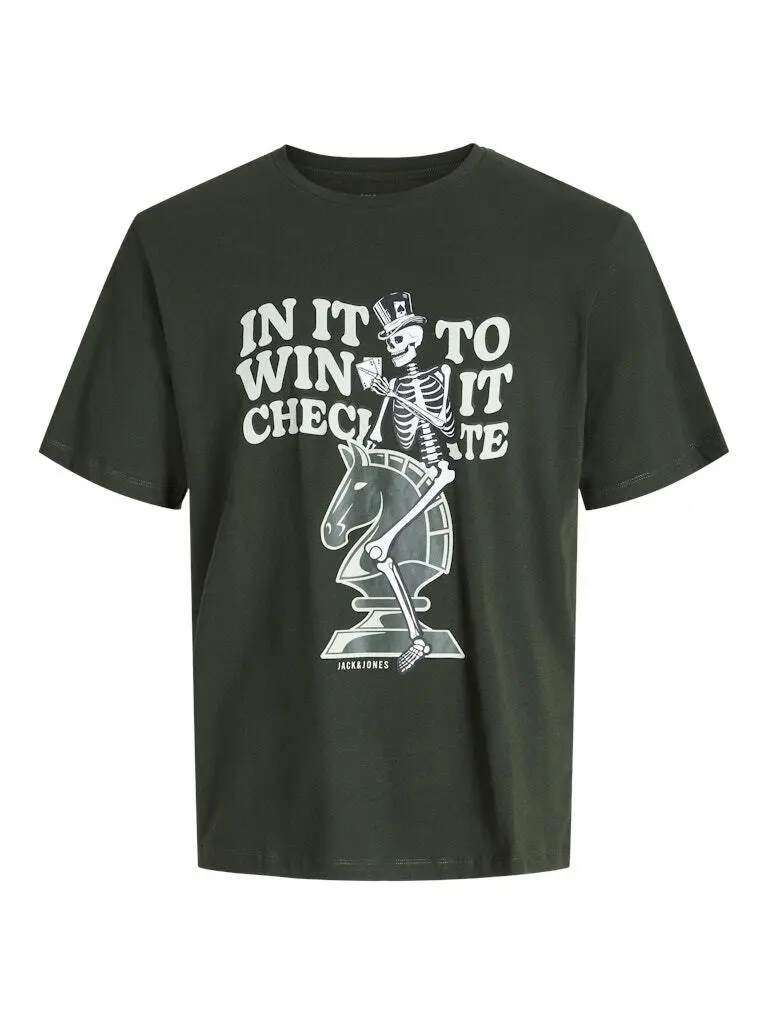 T-skjorte fra Jack & Jones i en dyp mørkegrønn farge med et stort frontprint. Motivet viser et skjelett iført høy hatt, som sitter selvsikkert på en sjakkbrikke og holder en kortstokk i hånden. Over står teksten In It To Win It – Checkmate, som understreker den selvsikre holdningen. T-skjorten er laget i en myk bomullskvalitet, har rund hals og korte ermer. Passformen er klassisk og behagelig – perfekt til hverdagsbruk eller når du vil gi antrekket ditt litt kant.