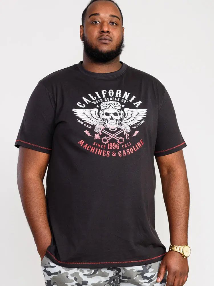 Den forvaskede svarte T-skjorten er laget av 100% bomull og er myk og behagelig å ha på. T-skjorten er prydet med et stort trykk på brystet. Trykket viser bl.a. teksten "California D555 Rebels Co" samt en "skalle med vinger og motorsykkelbriller". Nederst på trykket, i rødt, står det bl.a. "Machines & Gasoline".