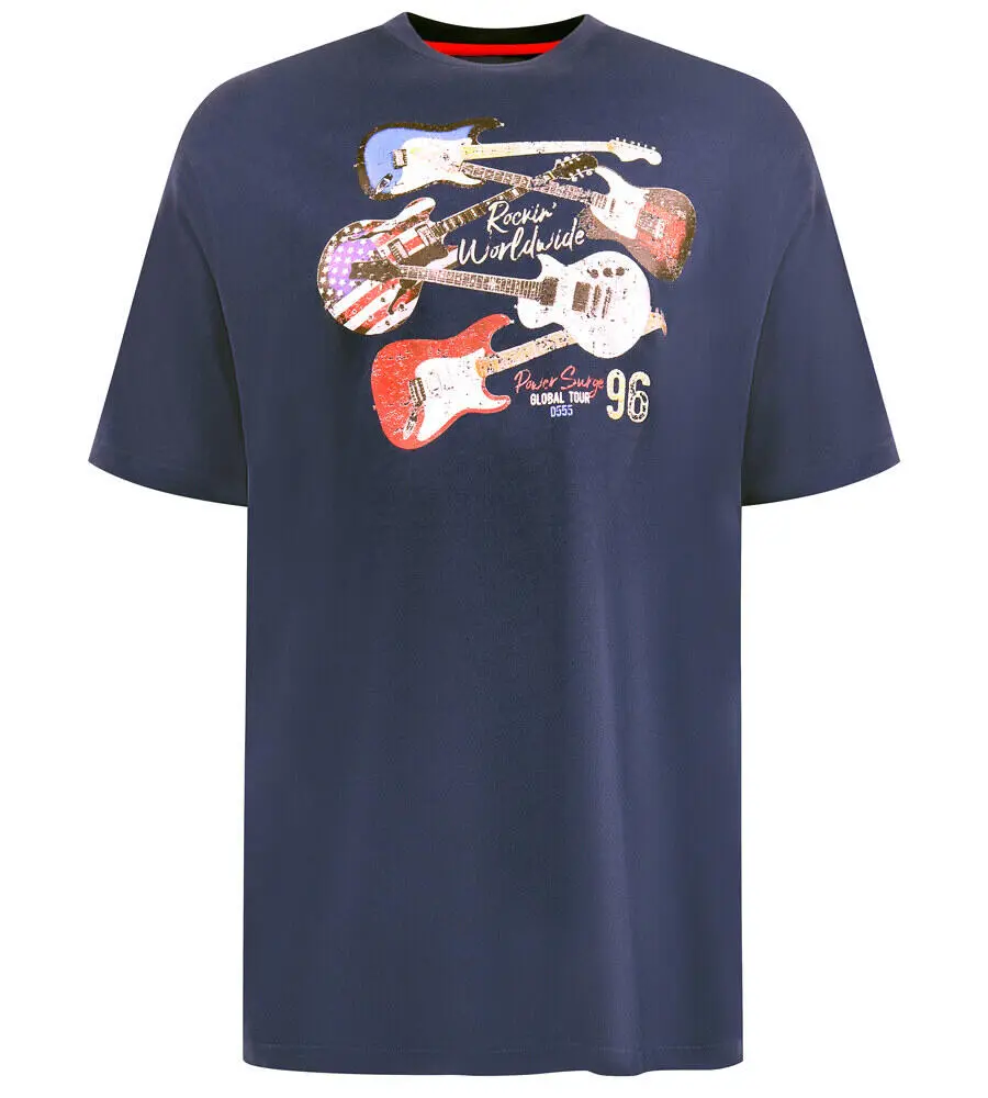 Denne marineblå T-skjorten fra D555 er et opplagt valg for deg som vil tilføre litt musikalsk kant til garderoben. Foran prydes den av et stort trykk med elektriske gitarer i forskjellige farger, samt teksten “Rockin’ Worldwide – Power Surge Global Tour 96”.