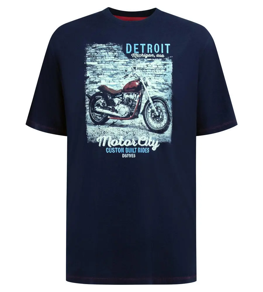 Denne mørke marineblå t-skjorten er laget i 100 % bomull og har et markant fronttrykk med motorsykkelmotiv og teksten Detroit – Motor City. Designet har et røft, vintageinspirert uttrykk med mursteinstema i bakgrunnen og en klassisk chopper-motorsykkel i fokus.