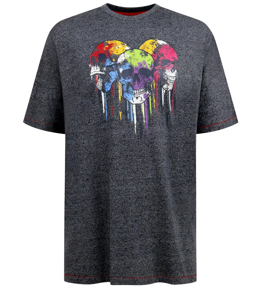 Denne navy-melert T-skjorten fra D555 er et opplagt valg for deg som vil ha et markant og annerledes uttrykk. Foran er den prydet med et stort fargerikt print av tre kranier i blått, grønt, gult, rødt og lilla, som skaper en røff og iøynefallende effekt.