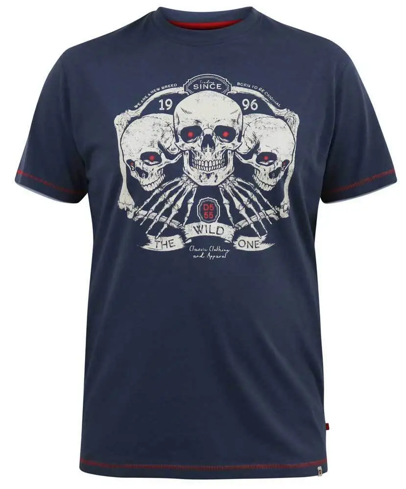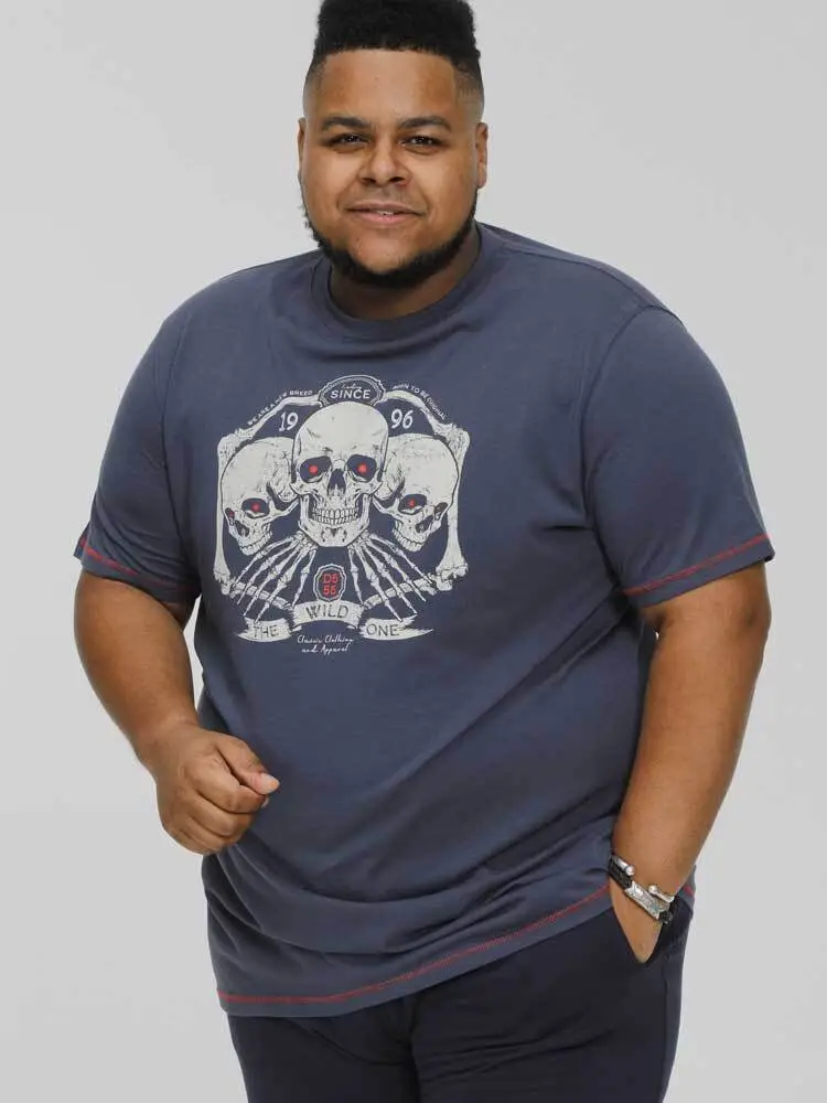 Ren, rå statement-print med en trio av skjeletthoder i lys grå, på en rolig støvet blå T-skjorte.