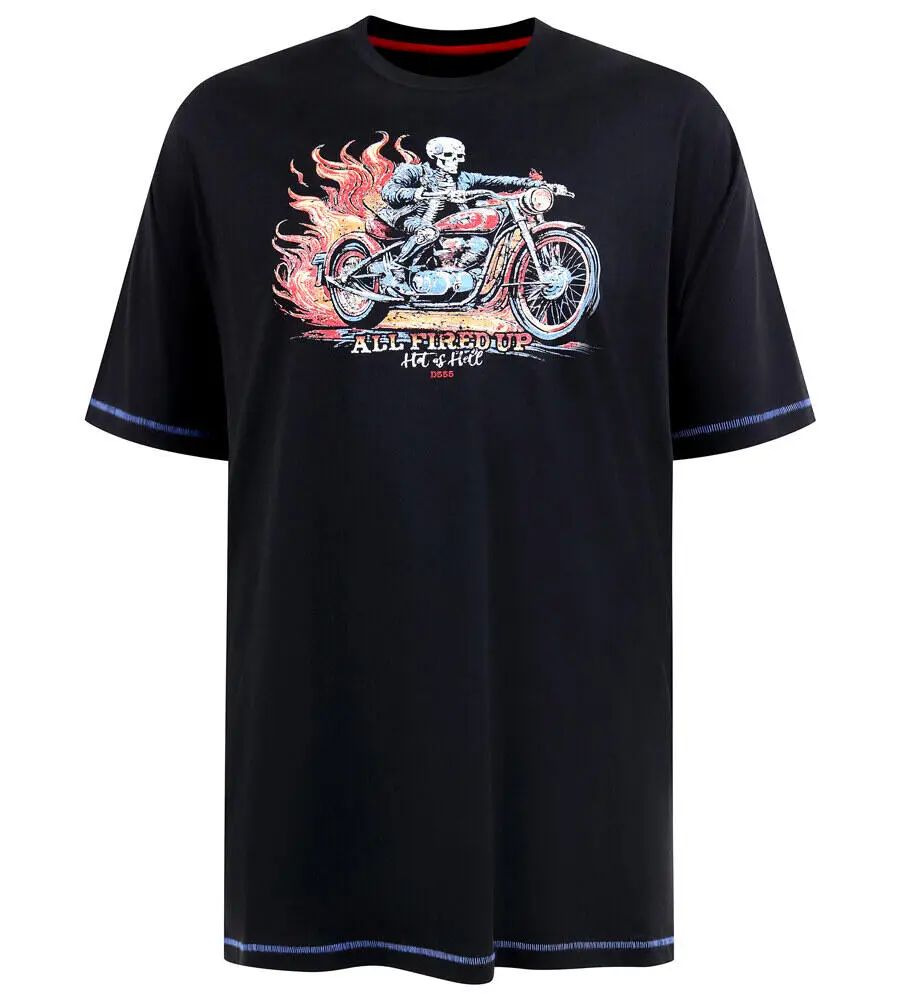 Denne svarte T-skjorten fra D555 er et åpenbart valg, hvis du vil ha et mer røft og markant uttrykk. På fremsiden prydes den av et stort trykk med en skjelettrytter på motorsykkel omgitt av flammer og teksten “All Fired Up – Hot as Hell”.