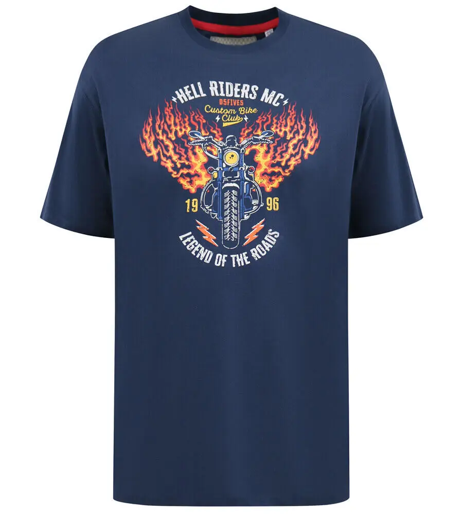 T-skjorte fra D555 med et markant fronttrykk av en motorsykkel omgitt av flammer og teksten “Hell Riders MC”, som gir et røft og maskulint uttrykk. Det grafiske designet tilfører mye attitude og gjør T-skjorten til et opplagt valg hvis du vil skille deg litt ut.