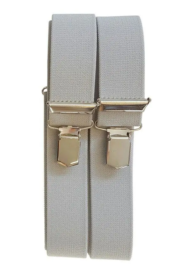 Lysgrå brede seler. Selene er 3,3 cm brede. Selene har kraftige klemmer som "biter" seg fast og holder buksene dine på plass.